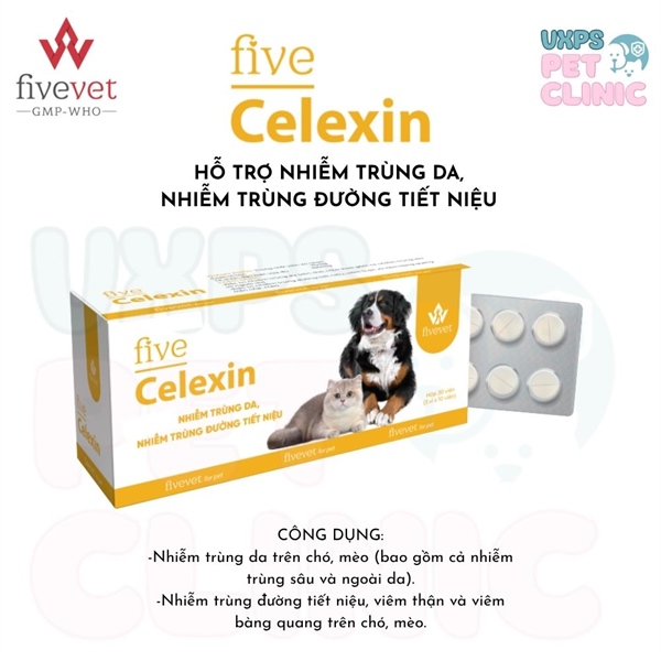 Five-Celexin – Viên uống hỗ trợ xử lý nhiễm trùng da và đường tiết niệu cho chó mèo (Hộp 3 vỉ x 10 viên)