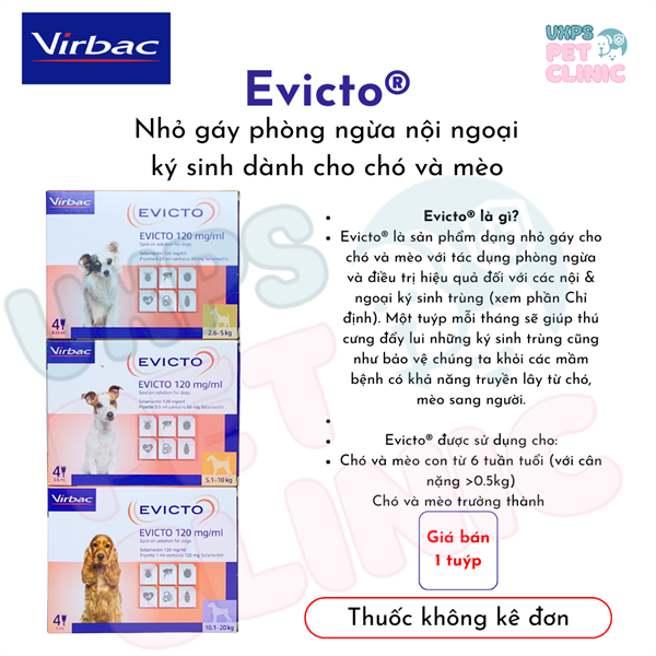 Evicto là sản phẩm dạng nhỏ gáy (spot-on) dành cho chó và mèo, giúp hỗ trợ bảo vệ thú cưng khỏi các ký sinh trùng nội và ngoại hiệu quả.